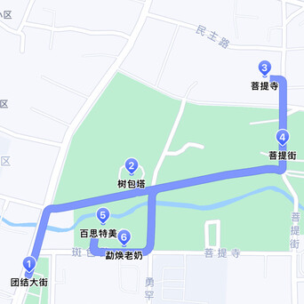 蹊径:协作大街→树包塔→菩提寺→菩提街→百斯特好意思食/勐焕老奶冷饮店