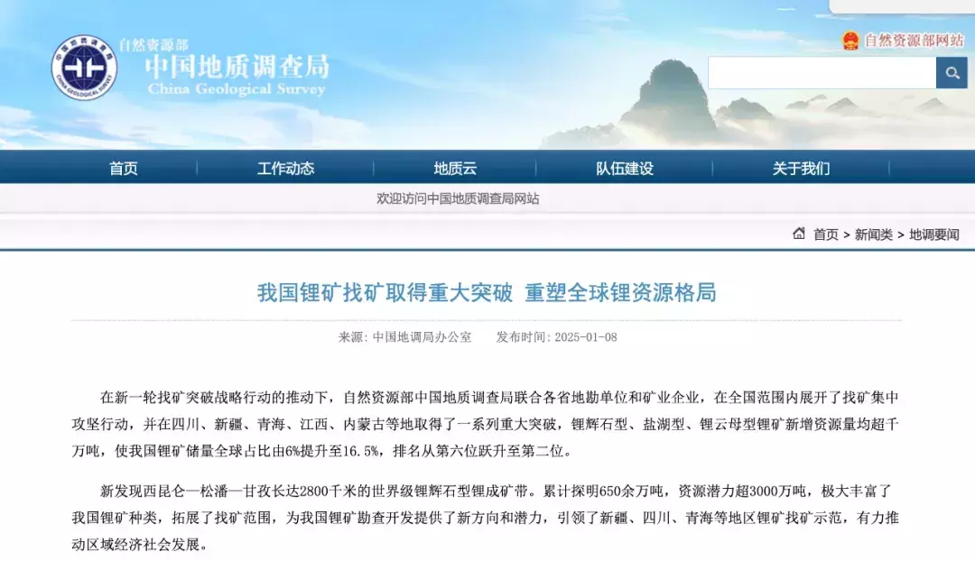 1月8日,天然资源部中国地质拜访局发布音信,中国锂矿找矿行径取得要紧冲突,锂矿储量全球占比由6%教育至16.5%!