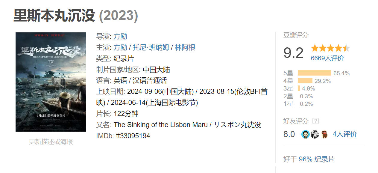 方励导演耗时8年制作完成的《里斯本丸千里没》上映的第四天开yun体育网,豆瓣开出9.2的高分。