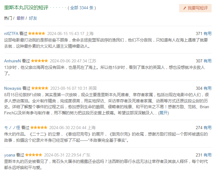 电影页面当场表露的五条挑剔,王人是五星好评。有不雅众写说念“这部电影最打动我的是那些摧坚陷阵,舍命去救济友军战俘的渔民们,他们不分敌我,只知说念有东说念主在海上受难了就要去救,这种最朴素的大义和东说念主说念主见精神最动东说念主。”还有不雅众称许《里斯本丸号》是“伟大的作品”,并称许电影是“《二十二》的立意,《泰坦尼克号》的张开,《敦刻尔克》的斥逐,感谢方励打捞起一个行将被渐忘的故事,拍摄这个记载片本人照旧迷漫了不得。”