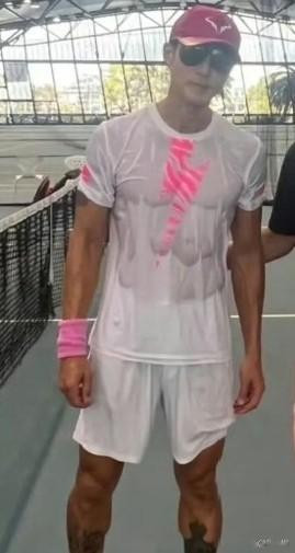再看他的身材,肩宽背厚、肌肉紧致,腹肌线条彰着,皮肤也紧致有晴明,莫得松垮的迹象,黑了一圈反而更显健康性感,男东说念主味十足