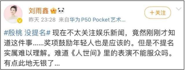 不外这和疼爱《东说念主世间》心爱殷桃的不雅众念念法应该亦然通常的,大众王人但愿我方心爱的演员功成名就,拿奖遍及。关联词也没必要一边合计可惜,又一边拉踩其他提名者。