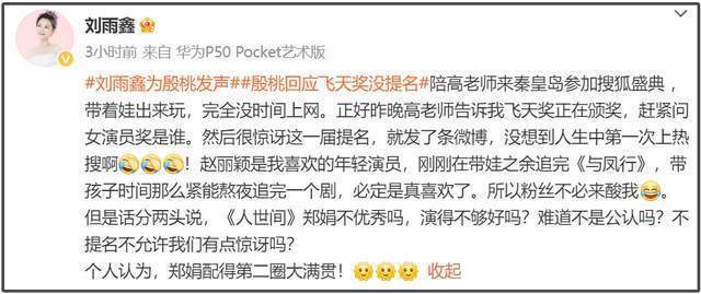 跟着事件发酵,刘雨鑫又发文复兴,线路赵丽颖是她心爱的年青演员,合计赵丽颖应该拿奖,改口不提饱读吹年青东说念主那一套。刘雨鑫回复网友称我方仅仅对殷桃在《东说念主世间》演的那么好,的确莫得提名线路缺憾和惊诧,莫得质疑的兴味。但却在发文收尾不忘强调,殷桃演出的扮装置得第二圈大满贯。话里话外,如故合计殷桃应该提名以致拿奖。