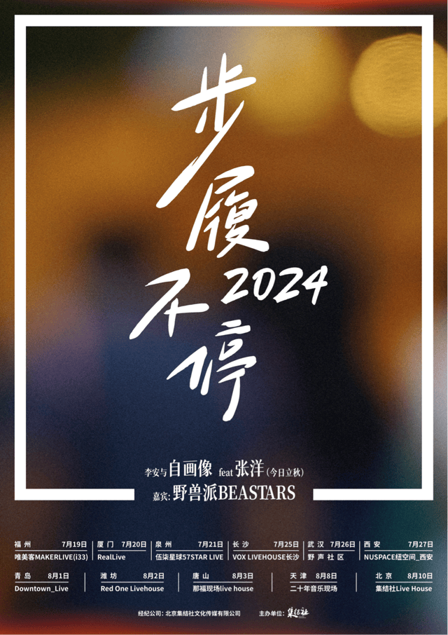 自画像乐队自建树以来,以独有并充满艺术气味的曲风和现场近乎癫狂的舞台扮演,招引了不少乐迷的嗜好,在阅历了几次东谈主员变更之后,乐队也完成了又一次自我改造,在新专辑刊行之际,集中社音乐联手自画像乐队开启「 步伐持续 」寰球巡演,将于7月19日起在福州、厦门、泉州、长沙、武汉、西安、青岛、潍坊、唐山、天津、北京共十一个城市连续开启。