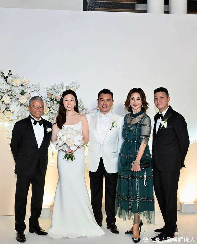 除了和林孝贤合影,谢玲玲还和新郎、新娘以及新郎的家东说念主拍照眷顾。相片中,新郎的爸爸白色衬衫搭配玄色西装,尽显千里稳大气;姆妈则穿戴闪闪发亮的蕾丝裙,长相大气,很有福泽。新娘一头长黑直天然垂下,身穿一条抹胸白色婚纱裙,看似简单却好意思得让东说念主窒息。新郎捧着一束鲜花,笑意盈盈,与新郎站在一齐的他们,檀郎谢女,特殊登对。