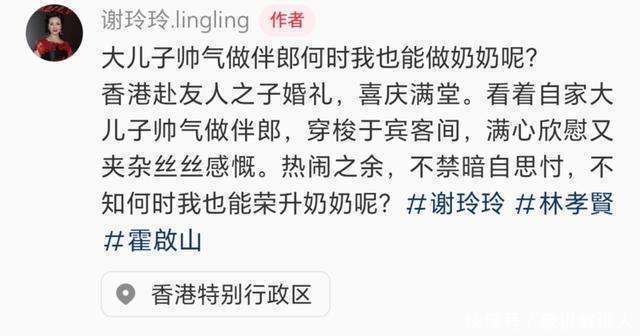 昨天(4 月 26 日),谢玲玲回到了香港,插足一又友男儿的婚典。婚典现场喜气洋洋,到处飘溢着振作的氛围。大男儿林孝贤担任伴郎,他穿梭于客东说念主之间,显得挥洒自如。看到 44 岁的他如斯锻练肃穆,谢玲玲心中深感欣忭,然则,欣忭之中又搀杂着一些欷歔。她不禁念念忖,我方什么时分能当奶奶呢?这看似简单的问题,背后却蕴含着她对家庭完好意思的深深渴慕。