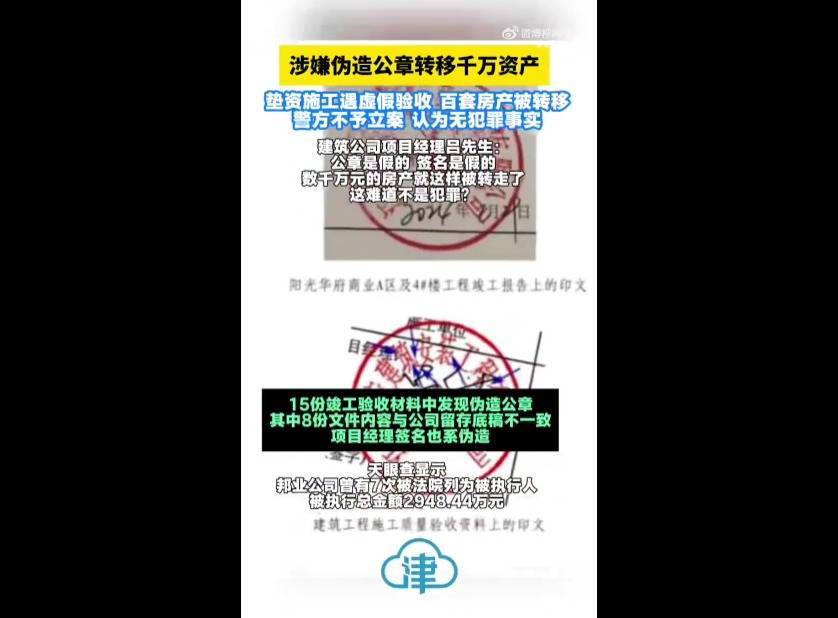 在报警后,当地警方却作念出“不予立案”的决定。“公章是假的,签名是假的,数千万元的房产就这么被转走了,这难说念不是监犯?”江苏国安建筑安设工程有限公司神色司理吕德充满疑问。