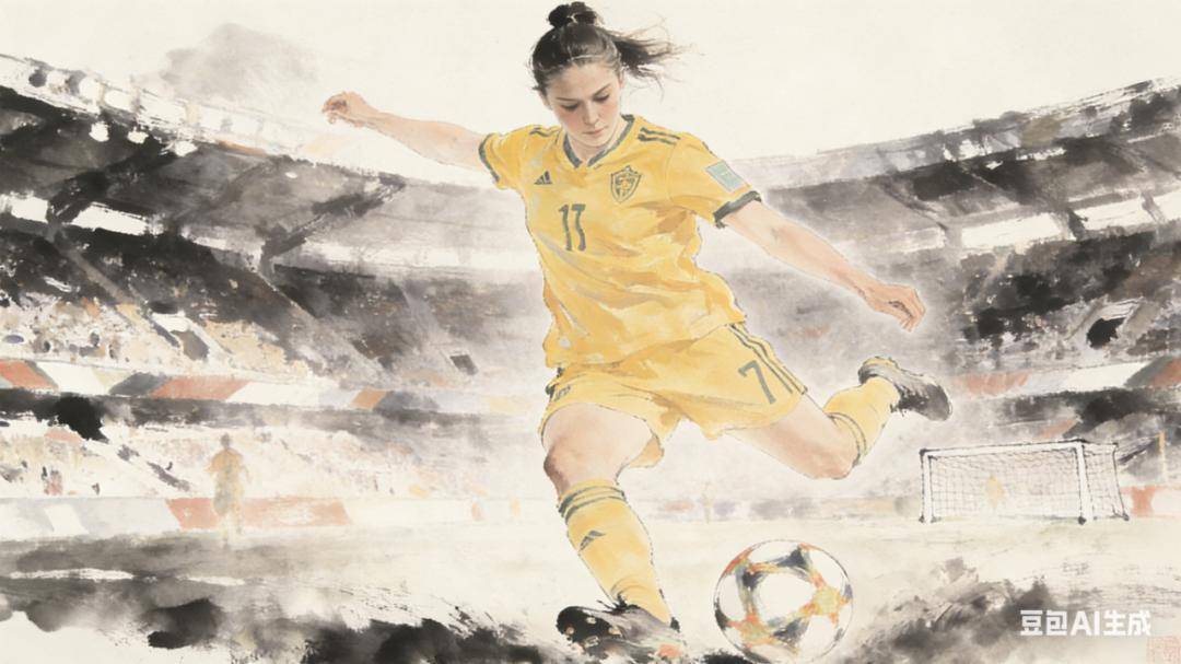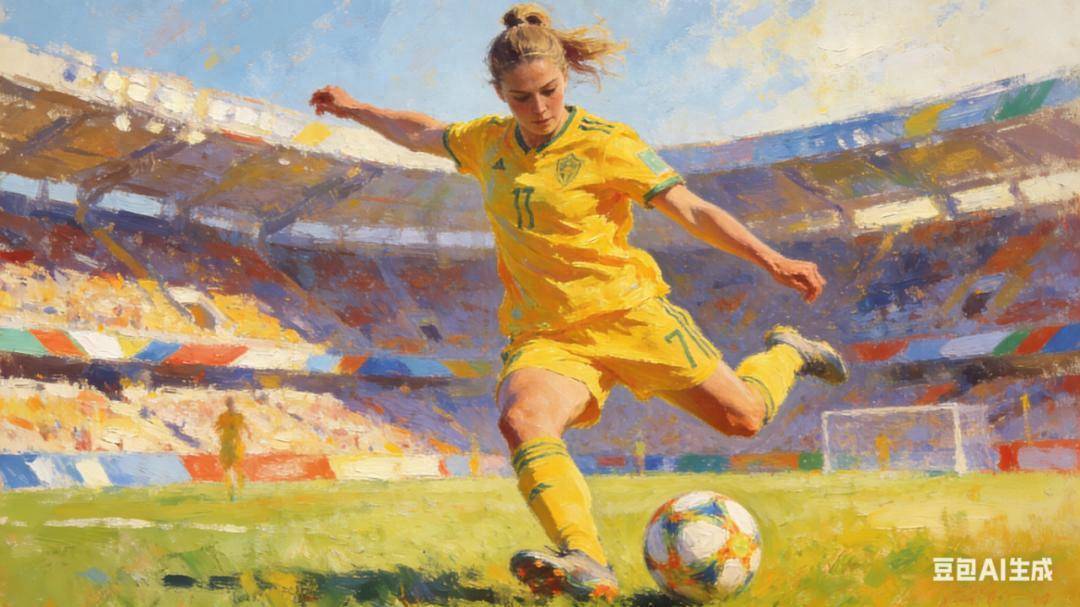 DeepSeek丰富了这句话——“她像一束流动的日光在翡翠色草甸上废弃——明黄色的战袍被汗水浸成深琥珀色斑块,绷紧的肌肉在纤薄布料下勾画出山峦般的升沉线条。每一个驰驱齐在空气中撕开金色残影,仿佛有十数个太阳同期在绿茵场上转机。”然后,笔者将这句话导入其他AI用具,生收效令更优质的图片。