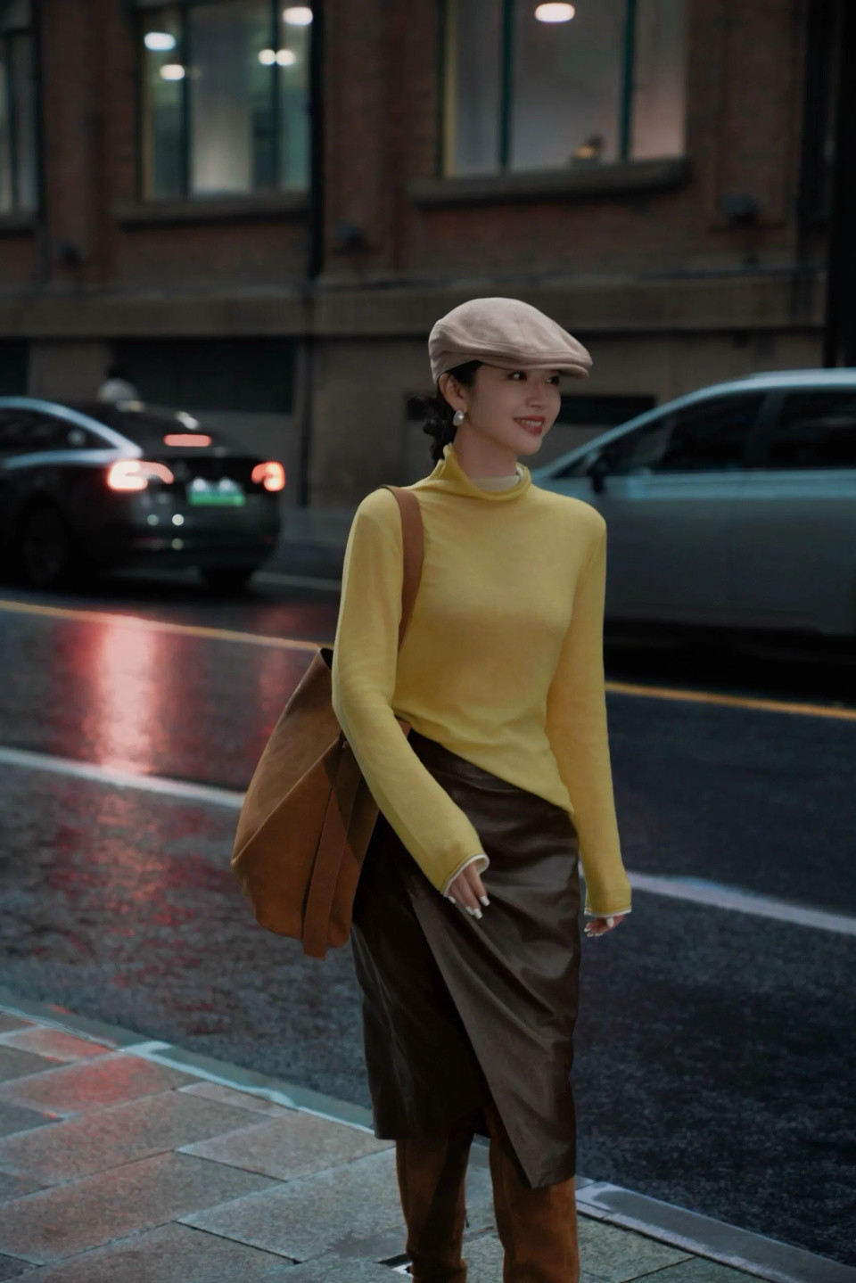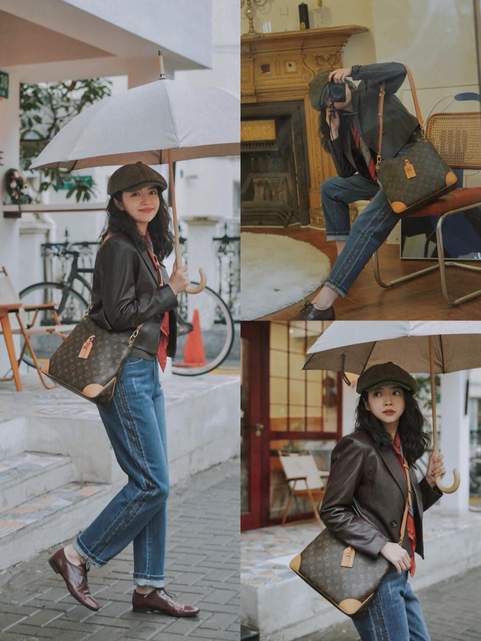 看这身棕色皮衣配牛仔裤的利落装束,头戴画家帽,巧用“上短下长”的步调,将身形勾画成齐备的三七分。