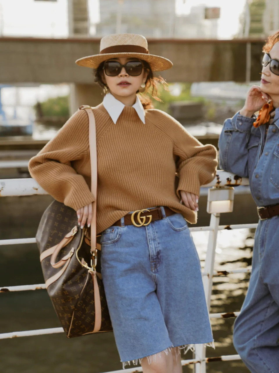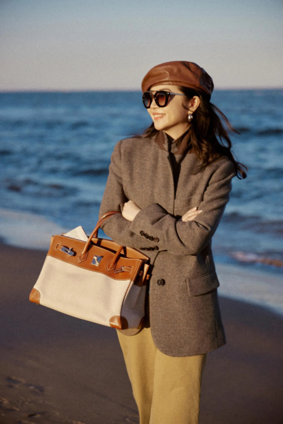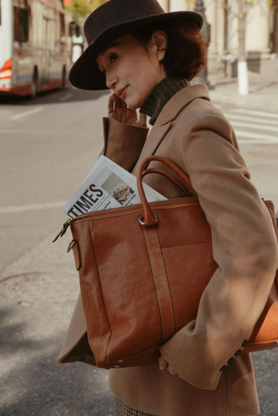 第二章节,凭据穿搭收受稳健造型的包包色调Tips①:驼色手提包