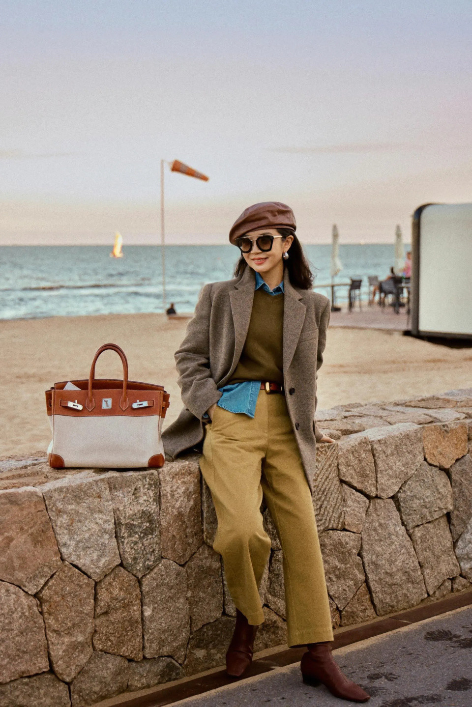 不妨学学三木博主,在海边的石栏静坐,手插裤兜,墨镜与贝雷帽勾画出轻视的酷感。
