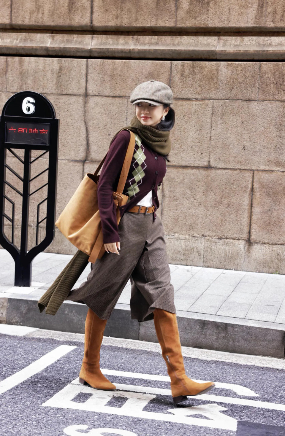 三木用格纹大衣配驼色真诚裙,贝雷帽与包包山鸣谷应,让色调在冷暖之间竣事了齐备的默契。