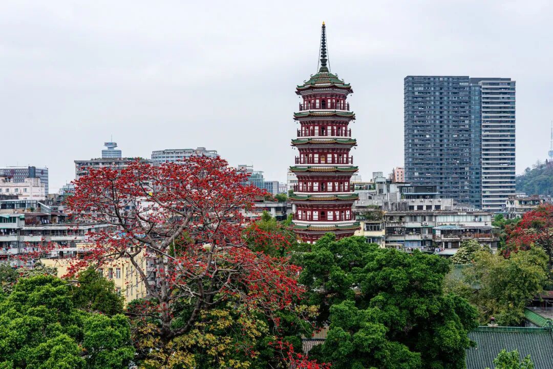 图片|广州六榕寺花塔与木棉花,六榕寺花塔位于六榕寺中央。平面呈八角形,外不雅9级,内连暗层共17层,高57.6米,现塔为宋代照原样重建 · 图虫创意 ©