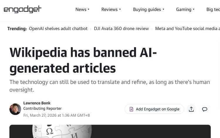 【各人网科技概括报谈】3月27日音信,据Engadget报谈,英文版维基百科近日告示更新剪辑规定,明确不容剪辑东谈主员使用东谈主工智能告成撰写或重写百科条件,不外并未全皆禁用AI器具,仍允许其在特定前提下用于实践润色与跨言语翻译,联系战略已追究纳入平台剪辑指南。