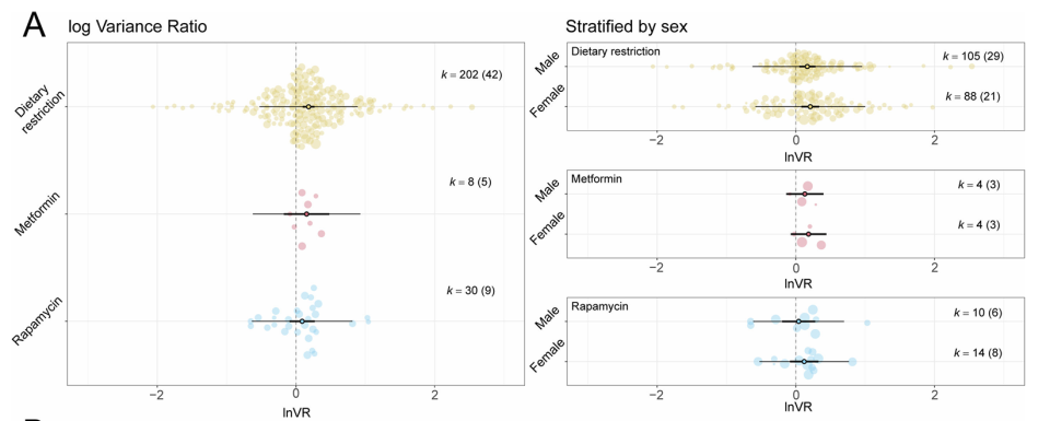 悉尼大学的筹谋详备分析了总变异性和相对均值的变异性。在通盘的治疗设施中,厌世年齿的法子差联系于对照组显赫增多了约17%。诚然雷帕霉素和二甲双胍对变异的单独影响在统计学上看似不够显赫,但它们与饮食铁心引起的显赫变异增多比拟,在统计学上并无内容别离。
