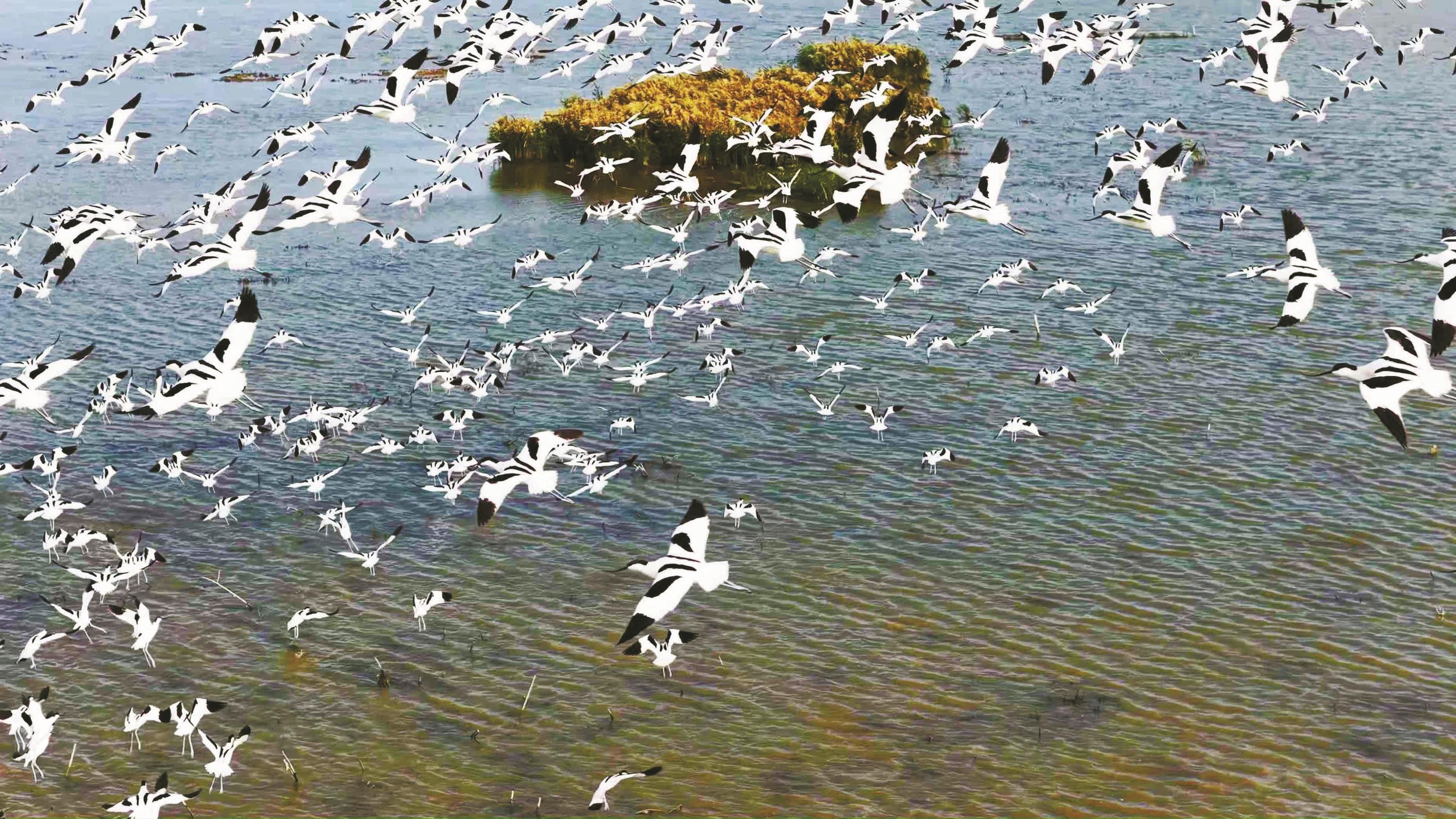 纯碎的反嘴鹬掠过浅滩啄食底栖生物,灰褐色野鸭浮水嬉戏,群鸟起落间,与水草丰茂的湿地、涌现的近岸水域织就共生图景。